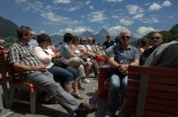 Unsere diesjährige Chorreise machten wir mit öffentlichen Verkehrsmitteln. Wir versammelten uns bei der Busstation Dorf und fuhren um 9.45 Uhr nach Luzern. Nach einem Wolkenbruch am früheren Morgen, der uns zittern liess, war der Himmel wieder blau und nur leicht bewölkt. Um elf Uhr bestiegen wir beim Bahnhofquai das Dampfschiff Rütli, den Tell Express. Wir deponierten unser Gepäck und suchten uns einen Platz auf dem Oberdeck. Unterwegs wurden an geschichtsträchtigen Stellen über den Lautsprecher Erklärungen dazu abgegeben.