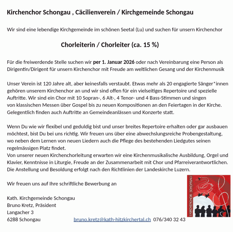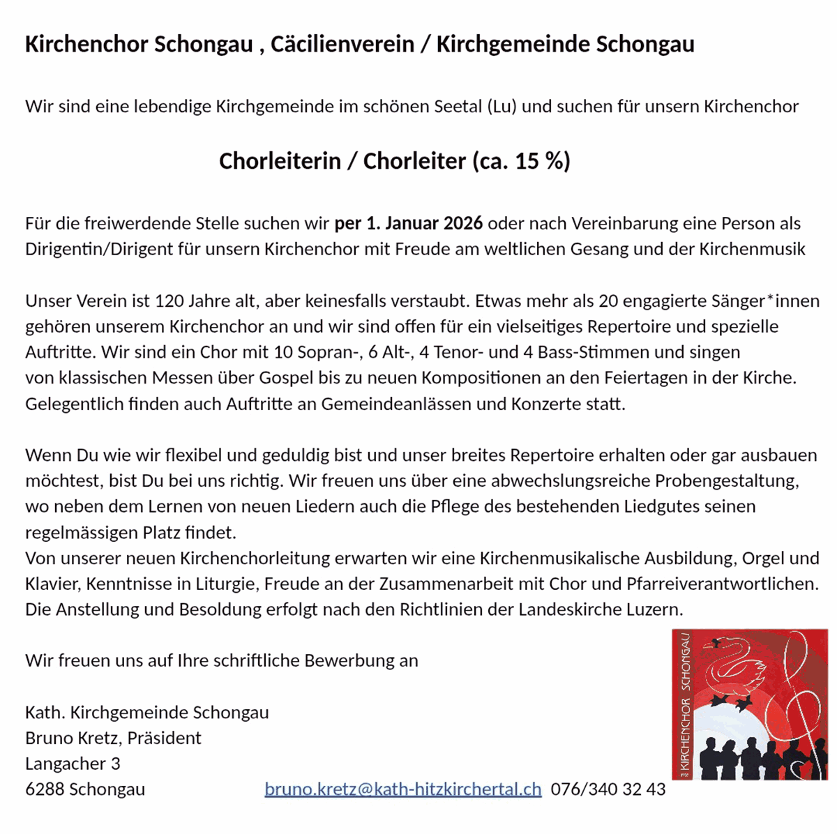 Die Kirchgemeinde Schongau im schönen Seetal sucht für den Kirchenchor per 1. Januar 2026 oder nach Vereinbarung eine Person als Dirigentin/Dirigent mit Freude am weltlichen Gesang und der Kirchenmusik.